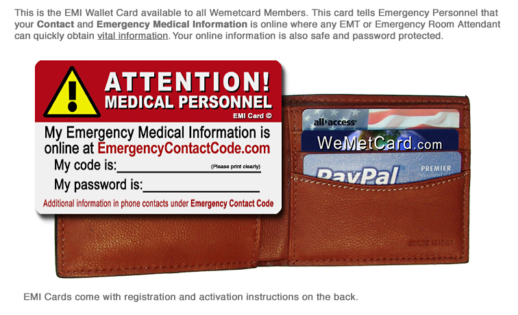 death. With your Emergency Contact Code and EMI password shown on your EMI Card, there are no delays. Emergency Medical Personnel have immediate online access to your listed emergency contact(s) and securepassword protectedemergency medical information. Read alarming medical statistics.